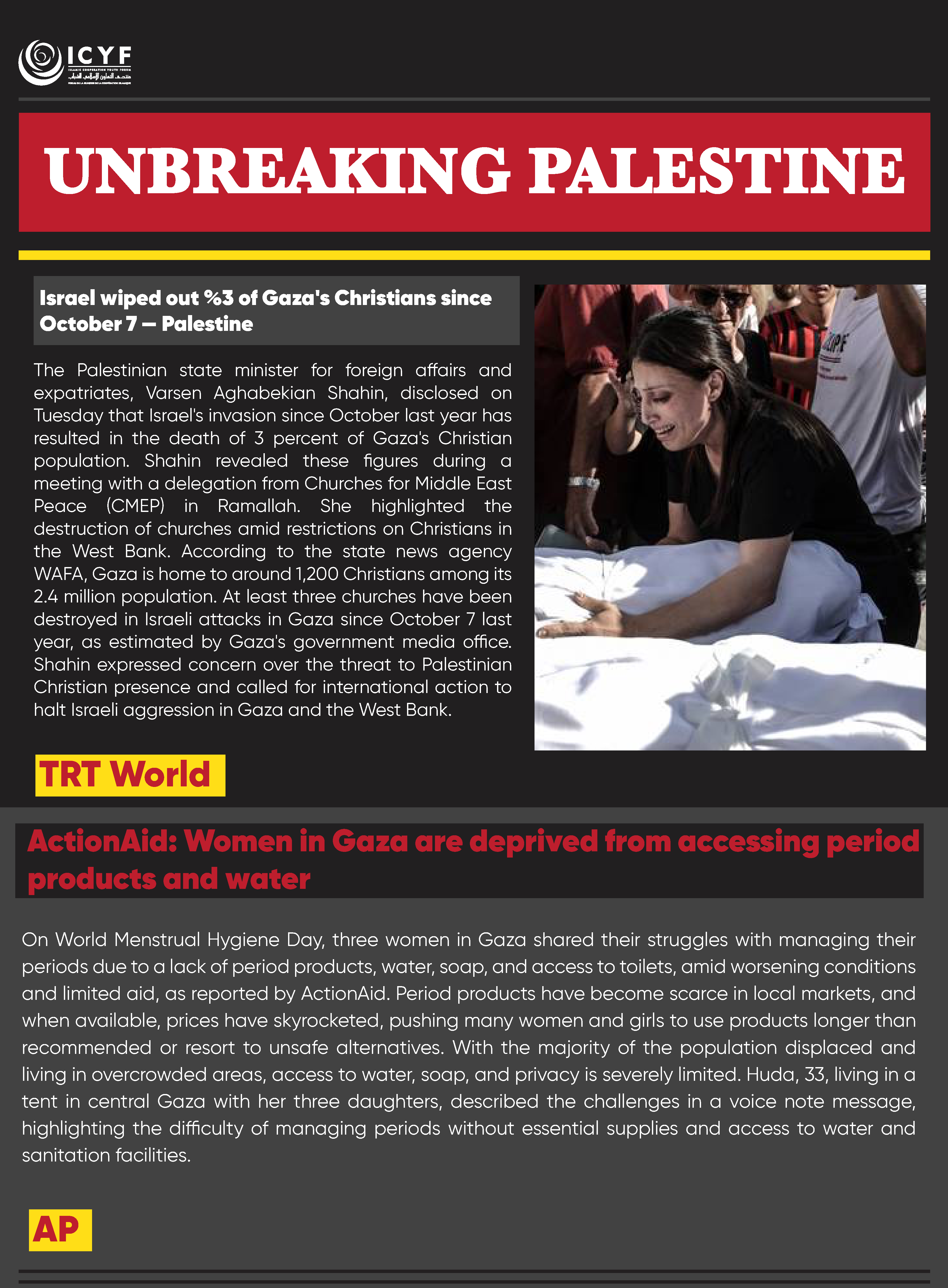 On World Menstrual Hygiene Day, three women in Gaza shared their struggles with managing their periods due to a lack of period products, water, soap, and access to toilets, amid worsening conditions and limited aid, as reported by ActionAid. Period products have become scarce in local markets, and when available, prices have skyrocketed, pushing many women and girls to use products longer than recommended or resort to unsafe alternatives. With the majority of the population displaced and living in overcrowded areas, access to water, soap, and privacy is severely limited. Huda, 33, living in a tent in central Gaza with her three daughters, described the challenges in a voice note message, highlighting the difficulty of managing periods without essential supplies and access to water and sanitation facilities.
