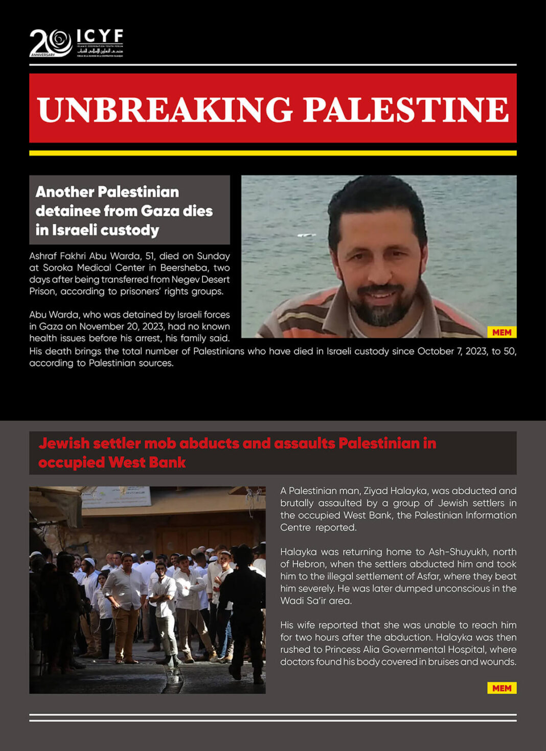 Ashraf Fakhri Abu Warda, 51, died on Sunday at Soroka Medical Center in Beersheba, two days after being transferred from Negev Desert Prison, according to prisoners’ rights groups. Abu Warda, who was detained by Israeli forces in Gaza on November 20, 2023, had no known health issues before his arrest, his family said. His death bringsthe total number of Palestinians who have died in Israeli custody since October 7, 2023, to 50, according to Palestinian sources.