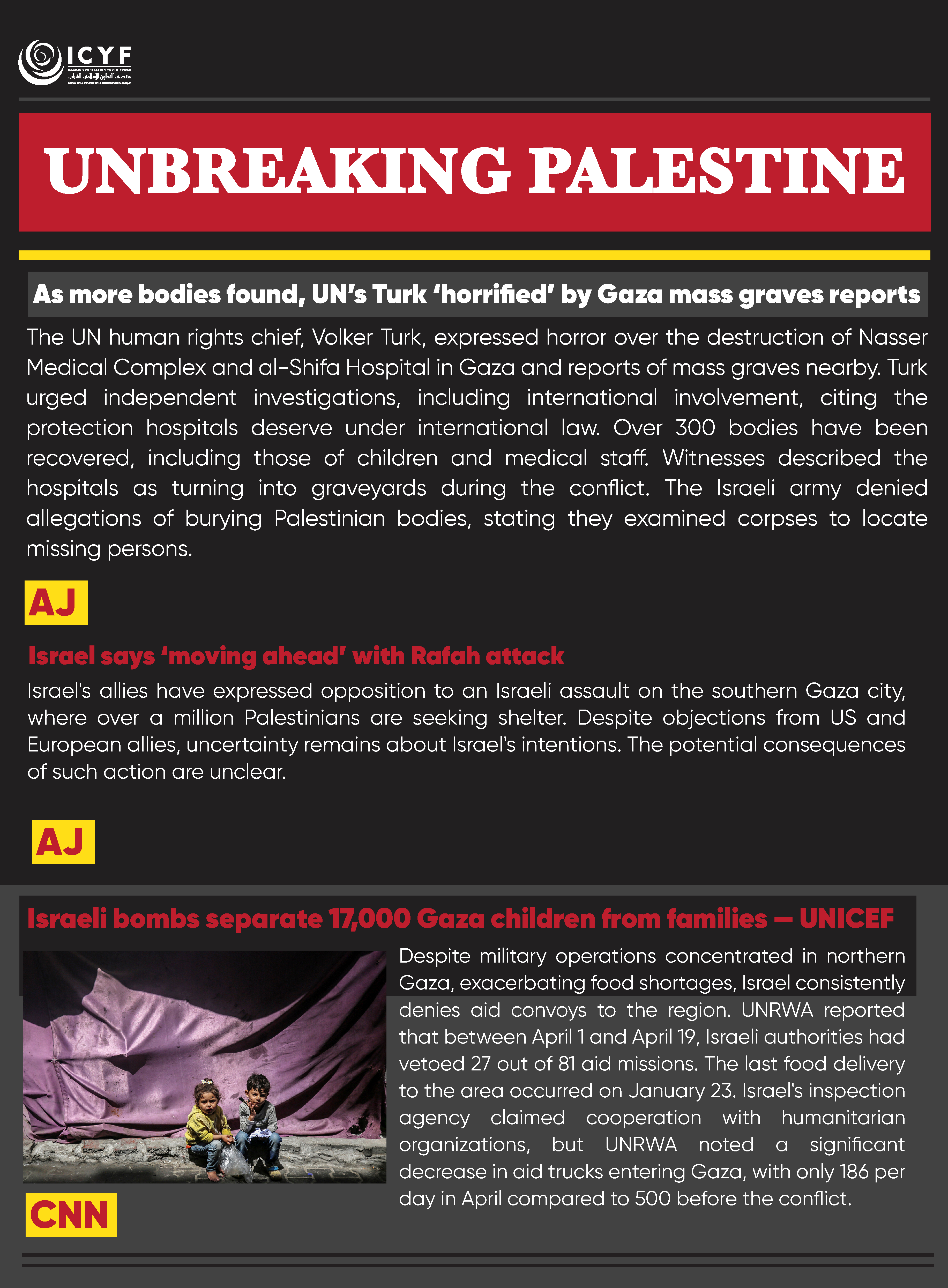 The UN human rights chief, Volker Turk, expressed horror over the destruction of Nasser Medical Complex and al-Shifa Hospital in Gaza and reports of mass graves nearby. Turk urged independent investigations, including international involvement, citing the protection hospitals deserve under international law. Over 300 bodies have been recovered, including those of children and medical staff. Witnesses described the hospitals as turning into graveyards during the conflict. The Israeli army denied allegations of burying Palestinian bodies, stating they examined corpses to locate missing persons.