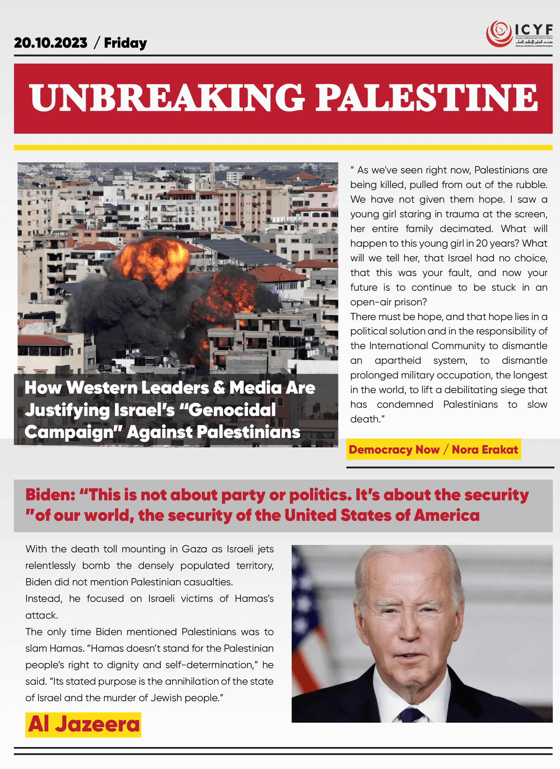 With the death toll mounting in Gaza as Israeli jets relentlessly bomb the densely populated territory, Biden did not mention Palestinian casualties. Instead, he focused on Israeli victims of Hamas’s attack. The only time Biden mentioned Palestinians was to slam Hamas. “Hamas doesn’t stand for the Palestinian people’s right to dignity and self-determination,” he said. “Its stated purpose is the annihilation of the state of Israel and the murder of Jewish people.”
