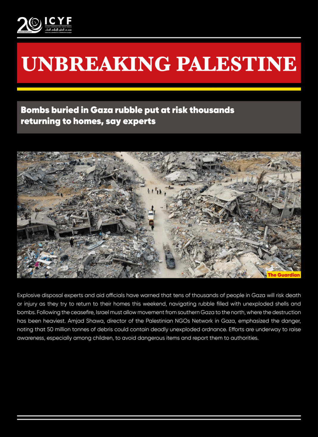 Explosive disposal experts and aid officials have warned that tens of thousands of people in Gaza will risk death or injury as they try to return to their homes this weekend, navigating rubble filled with unexploded shells and bombs. Following the ceasefire, Israel must allow movement from southern Gaza to the north, where the destruction has been heaviest. Amjad Shawa, director of the Palestinian NGOs Network in Gaza, emphasized the danger, noting that 50 million tonnes of debris could contain deadly unexploded ordnance. Efforts are underway to raise awareness, especially among children, to avoid dangerous items and report them to authorities.