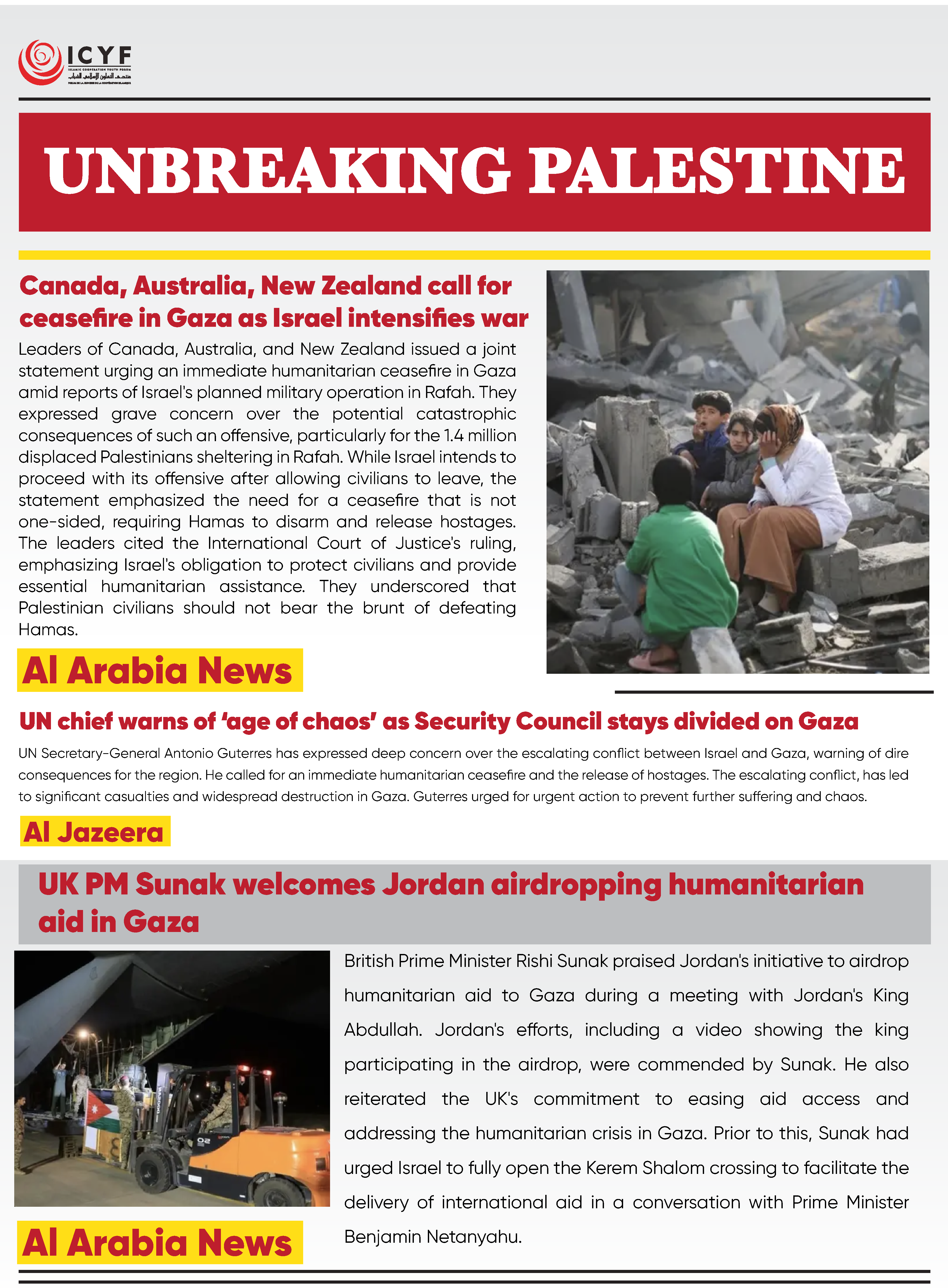 Leaders of Canada, Australia, and New Zealand issued a joint statement urging an immediate humanitarian ceasefire in Gaza amid reports of lsrael’s planned military operation in Rafah. They expressed grave concern over the potential catastrophic consequences of such an offensive, particularly tor the 1.4 million displaced Palestinians sheltering in Rafah. While lsrael intends to proceed with its offensive after allowing civilians to leave, the statement emphasized the need tor a ceaseiire that is not one-sided, requiring Hamas to disarm and release hostages. The leaders cited the lnternational Court of Justice’s ruling, emphasizing lsrael’s obligation to protect civilians and provide essential humanitarian assistance. They underscored that Palestinian civilians should not bear the brunt of defeating Hamas.