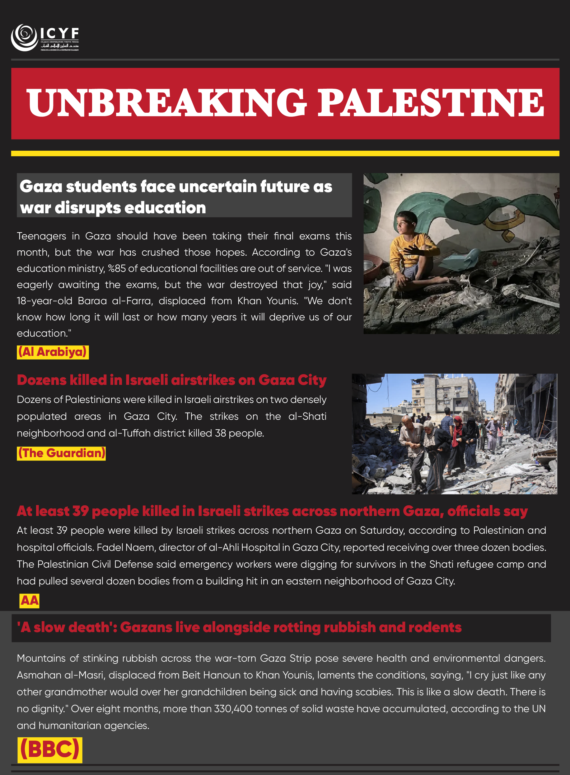 Dozens of Palestinians were killed in Israeli airstrikes on two densely populated areas in Gaza City. The strikes on the al-Shati neighborhood and al-Tuffah district killed 38 people.