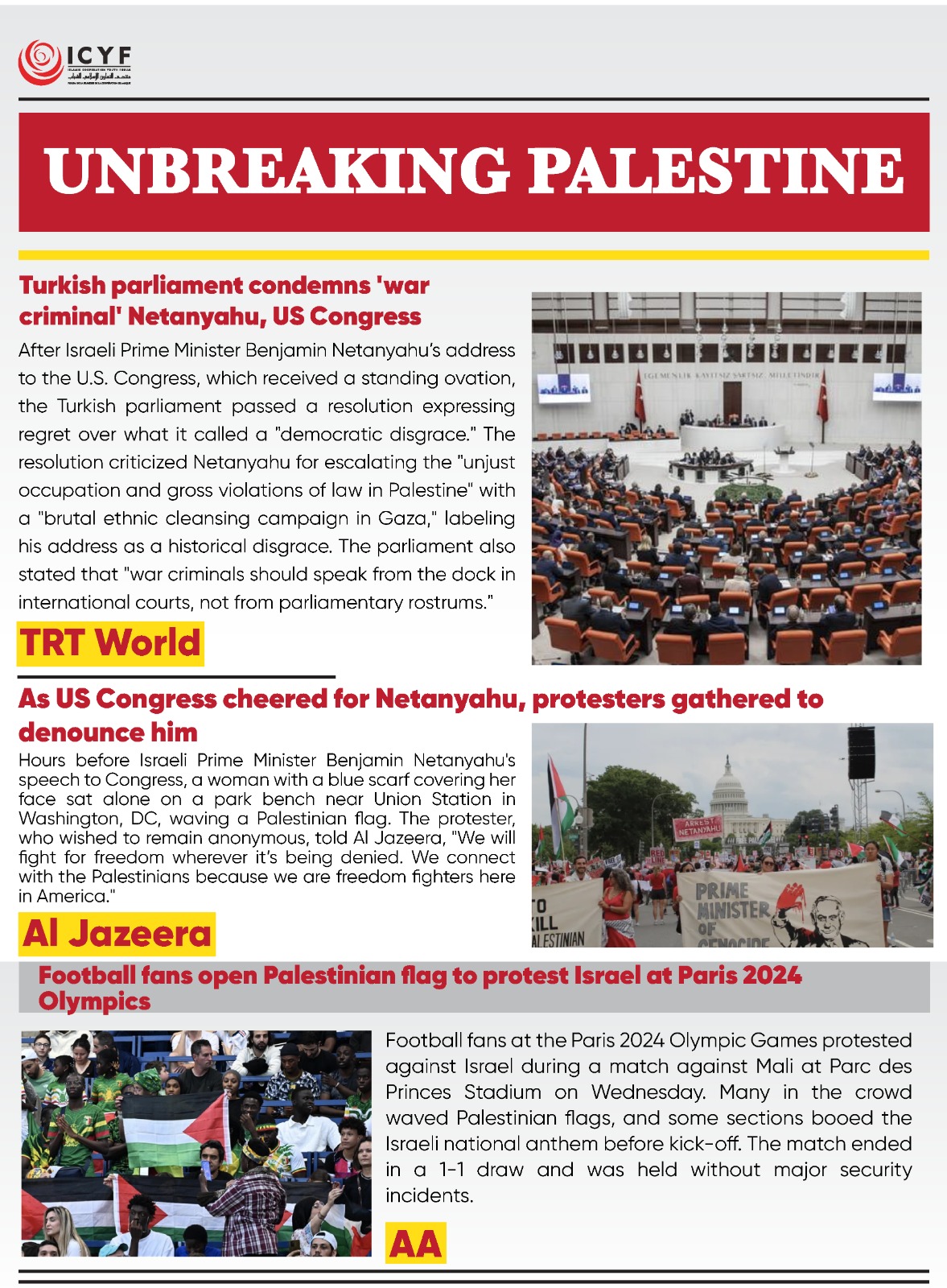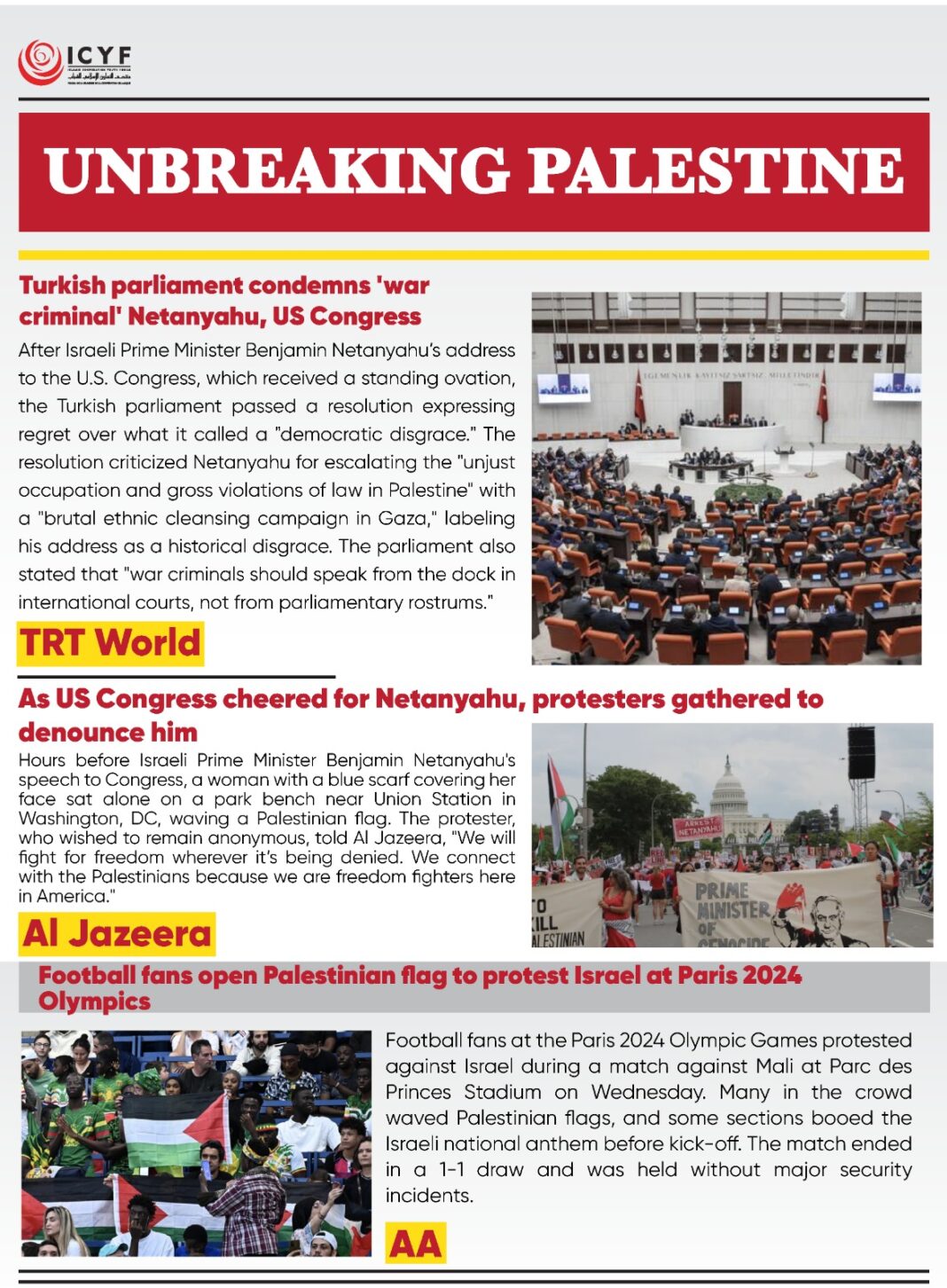 Football fans at the Paris 2024 Olympic Games protested against Israel during a match against Mali at Parc des Princes Stadium on Wednesday. Many in the crowd waved Palestinian flags, and some sections booed the Israeli national anthem before kick-off. The match ended in a 1-1 draw and was held without major security incidents.