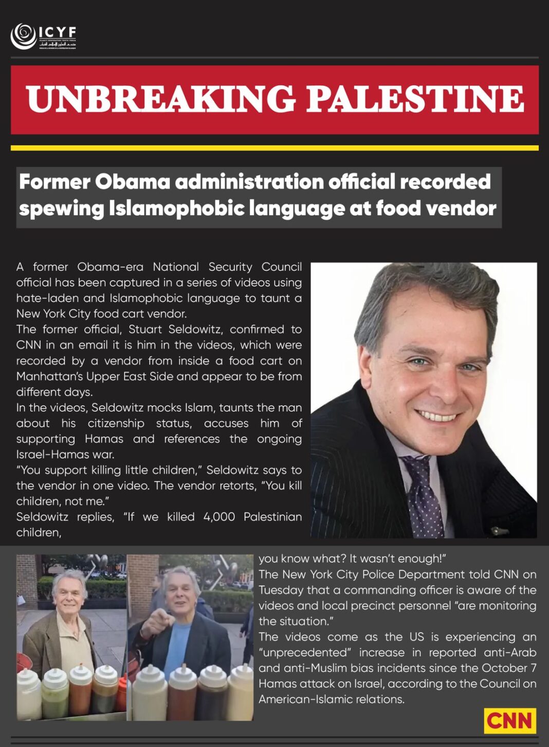 In the videos, Seldowitz mocks Islam, taunts the man about his citizenship status, accuses him of supporting Hamas and references the ongoing Israel-Hamas war.