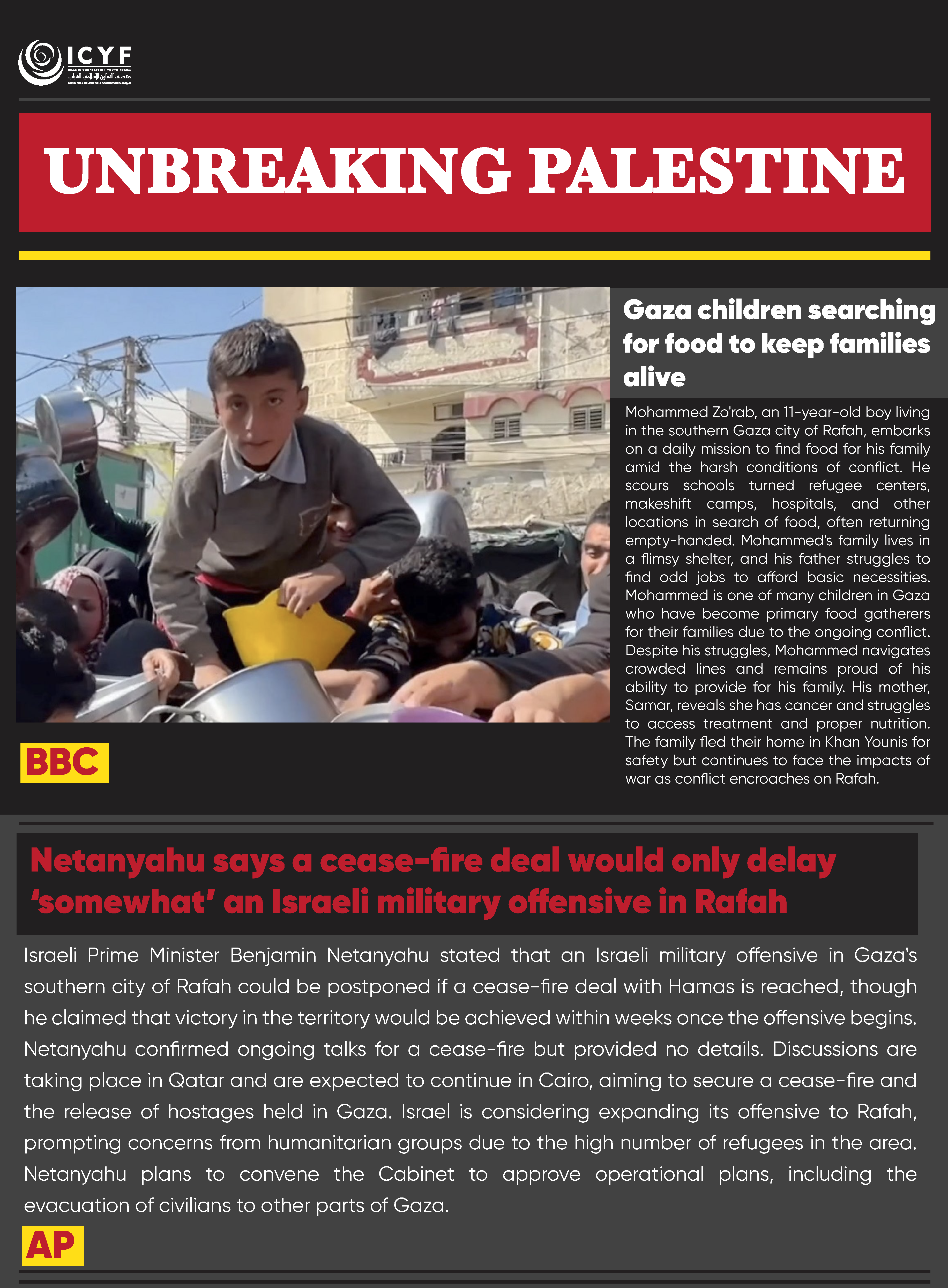 Mohammed Zo’rab, an 11-year-old boy living in the southern Gaza city of Rafah, embarks on a daily mission to find food for his family amid the harsh conditions of conflict. He scours schools turned refugee centers, makeshift camps, hospitals, and other locations in search of food, often returning empty-handed. Mohammed’s family lives in a flimsy shelter, and his father struggles to find odd jobs to afford basic necessities. Mohammed is one of many children in Gaza who have become primary food gatherers for their families due to the ongoing conflict. Despite his struggles, Mohammed navigates crowded lines and remains proud of his ability to provide for his family. His mother, Samar, reveals she has cancer and struggles to access treatment and proper nutrition. The family fled their home in Khan Younis for safety but continues to face the impacts of war as conflict encroaches on Rafah.