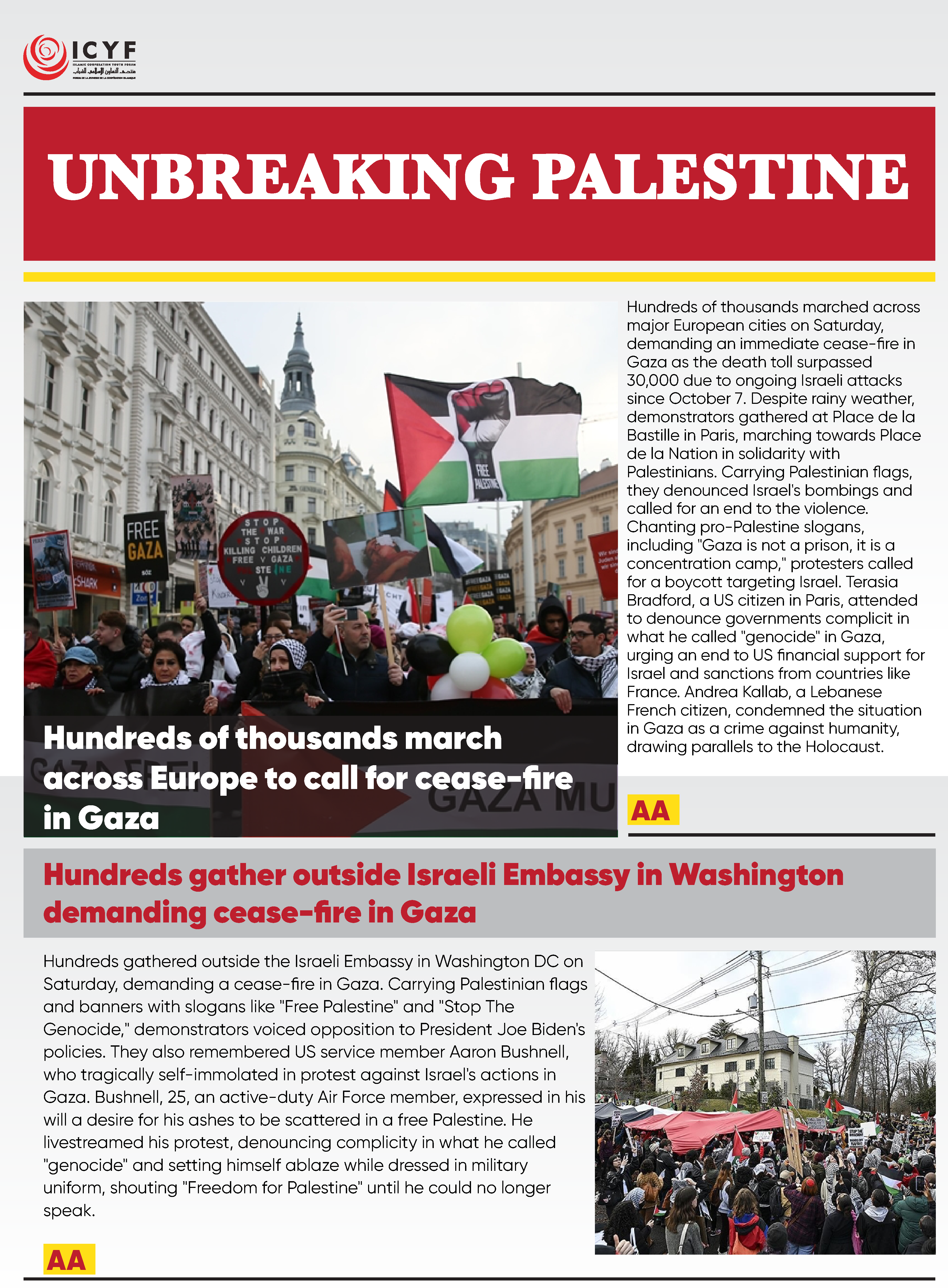 Hundreds gathered outside the Israeli Embassy in Washington DC on Saturday, demanding a cease-fire in Gaza. Carrying Palestinian flags and banners with slogans like “Free Palestine” and “Stop The Genocide,” demonstrators voiced opposition to President Joe Biden’s policies. They also remembered US service member Aaron Bushnell, who tragically self-immolated in protest against Israel’s actions in Gaza. Bushnell, 25, an active-duty Air Force member, expressed in his will a desire for his ashes to be scattered in a free Palestine. He livestreamed his protest, denouncing complicity in what he called “genocide” and setting himself ablaze while dressed in military uniform, shouting “Freedom for Palestine” until he could no longer speak.