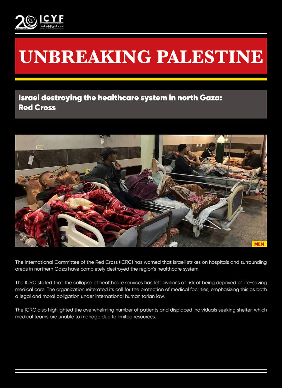 The International Committee of the Red Cross (ICRC) has warned that Israeli strikes on hospitals and surrounding areas in northern Gaza have completely destroyed the region’s healthcare system. The ICRC stated that the collapse of healthcare services has left civilians at risk of being deprived of life-saving medical care. The organization reiterated its call for theprotection of medical facilities, emphasizing this as both a legal and moral obligation under international humanitarian law. The ICRC also highlighted the overwhelming number of patients and displaced individuals seeking shelter, which medical teams are unable to manage due to limited resources.