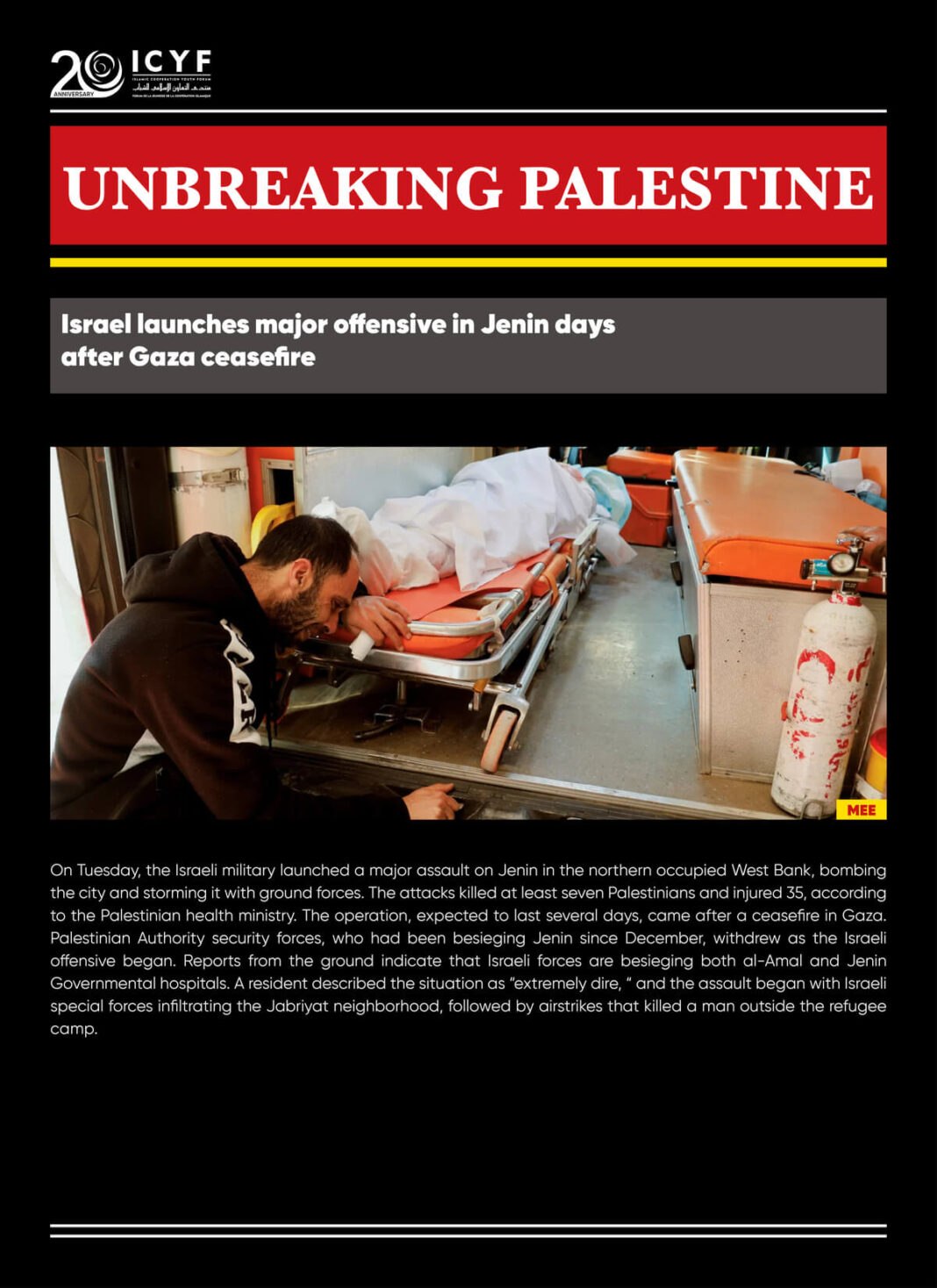 On Tuesday, the Israeli military launched a major assault on Jenin in the northern occupied West Bank, bombing the city and storming it with ground forces. The attacks killed at least seven Palestinians and injured 35, according to the Palestinian health ministry. The operation, expected to lastseveral days, came after a ceasefire in Gaza. Palestinian Authority security forces, who had been besieging Jenin since December, withdrew as the Israeli offensive began. Reports from the ground indicate that Israeli forces are besieging both al-Amal and Jenin Governmental hospitals. A resident described the situation as “extremely dire, ” and the assault began with Israeli special forces infiltrating the Jabriyat neighborhood, followed by airstrikes that killed a man outside the refugee camp.