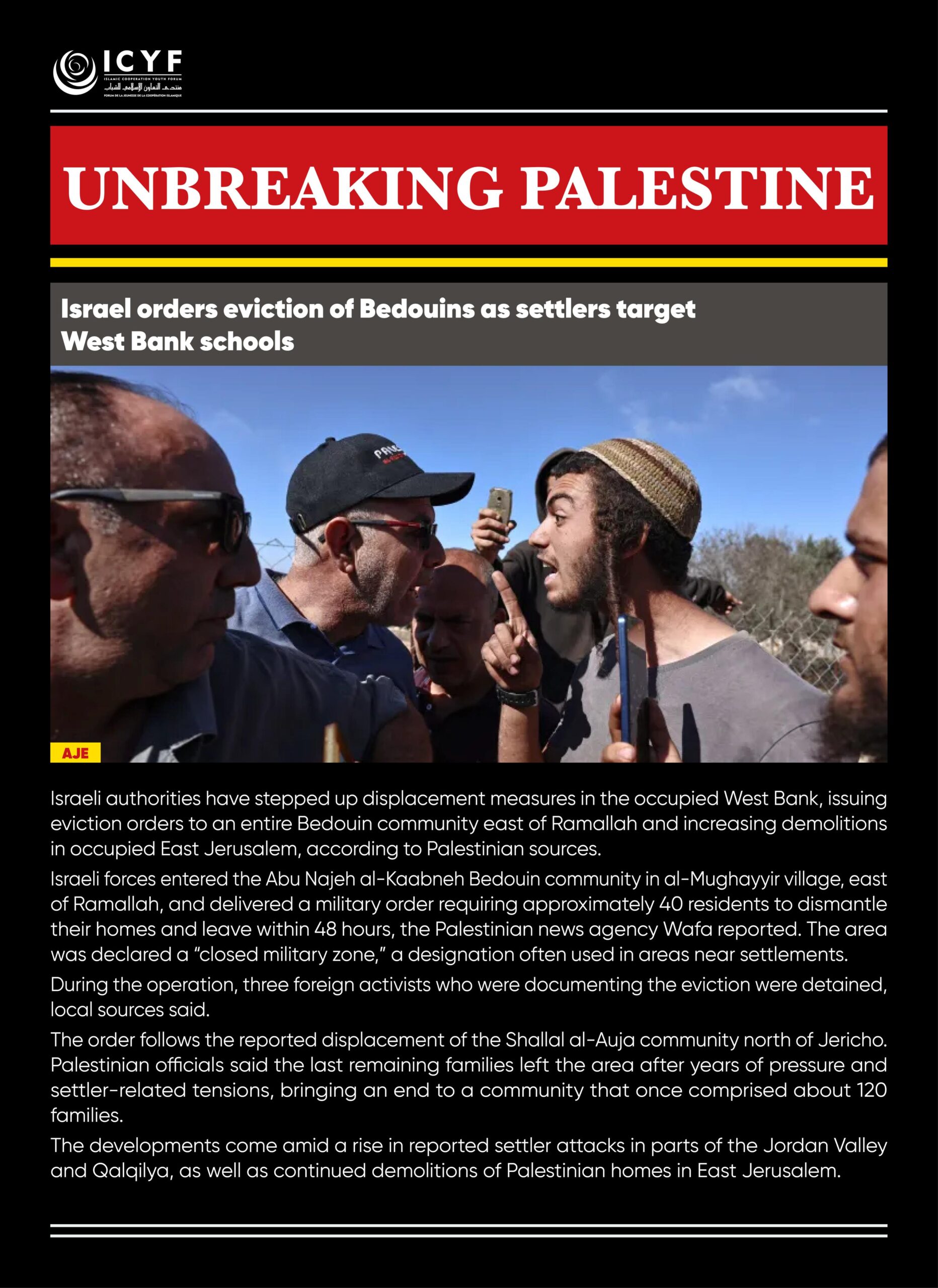 The order follows the reported displacement of the Shallal al-Auja community north of Jericho Palestinian officials said the last remaining families left the area after years of pressure and settler-related tensions, bringing an end to a community that once comprised about 120 families.