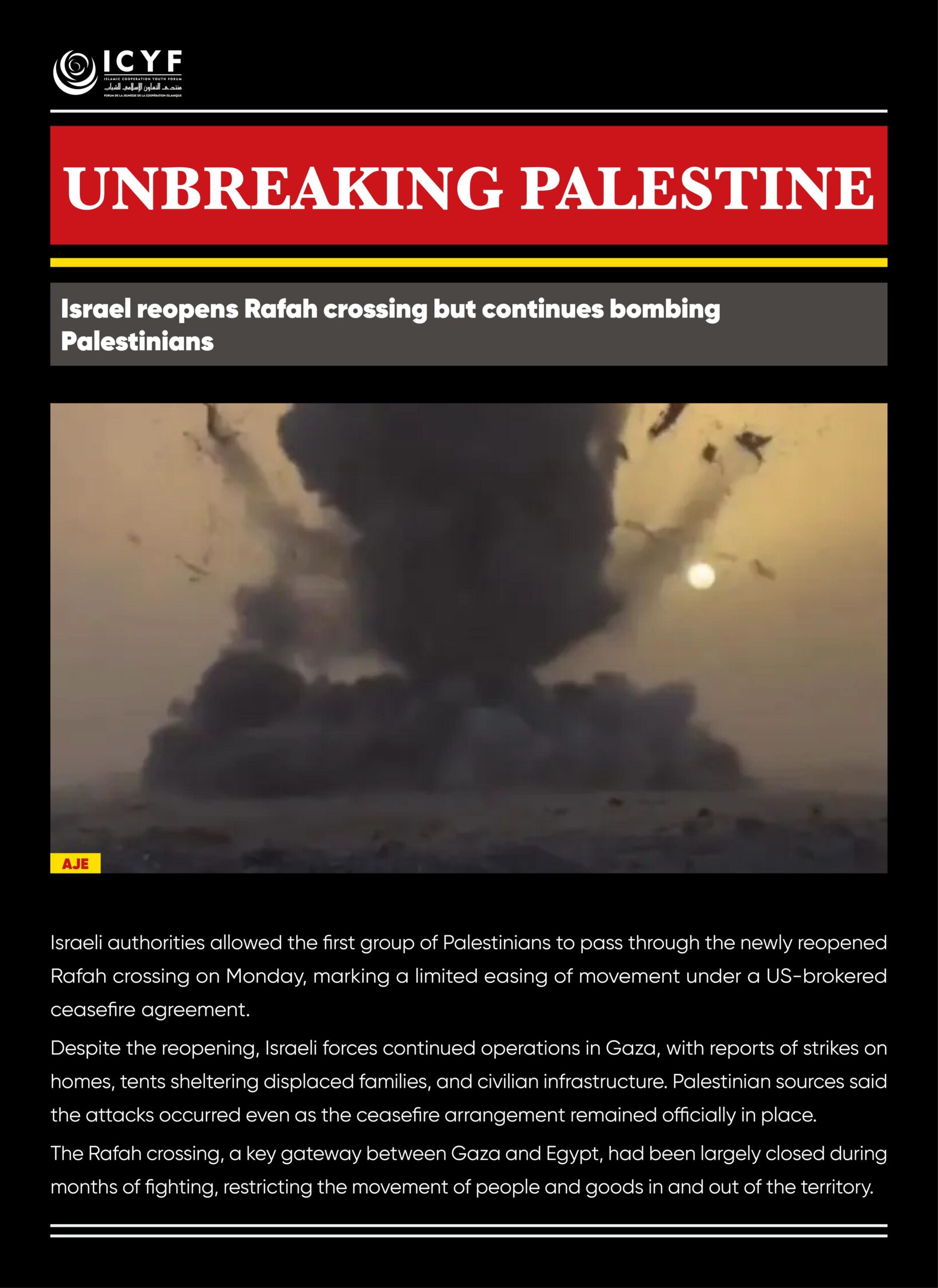 Despite the reopening, Israeli forces continued operations in Gaza, with reports of strikes on homes, tents sheltering displaced families, and civilian infrastructure. Palestinian sources said the attacks occurred even as the ceasefire arrangement remained officially in place.