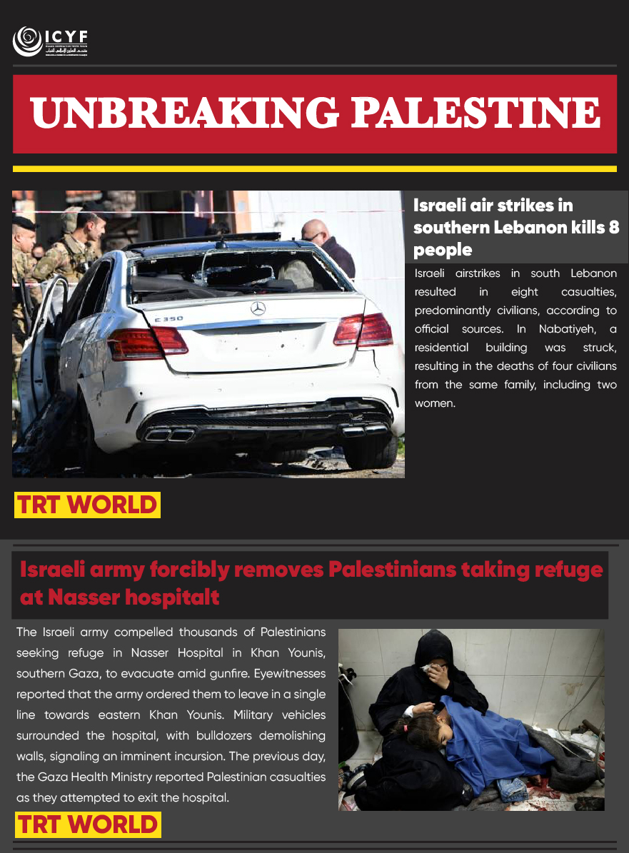 The Israeli army compelled thousands of Palestinians seeking refuge in Nasser Hospital in Khan Younis, southern Gaza, to evacuate amid gunfire. Eyewitnesses reported that the army ordered them to leave in a single line towards eastern Khan Younis. Military vehicles surrounded the hospital, with bulldozers demolishing walls, signaling an imminent incursion. The previous day, the Gaza Health Ministry reported Palestinian casualties as they attempted to exit the hospital.