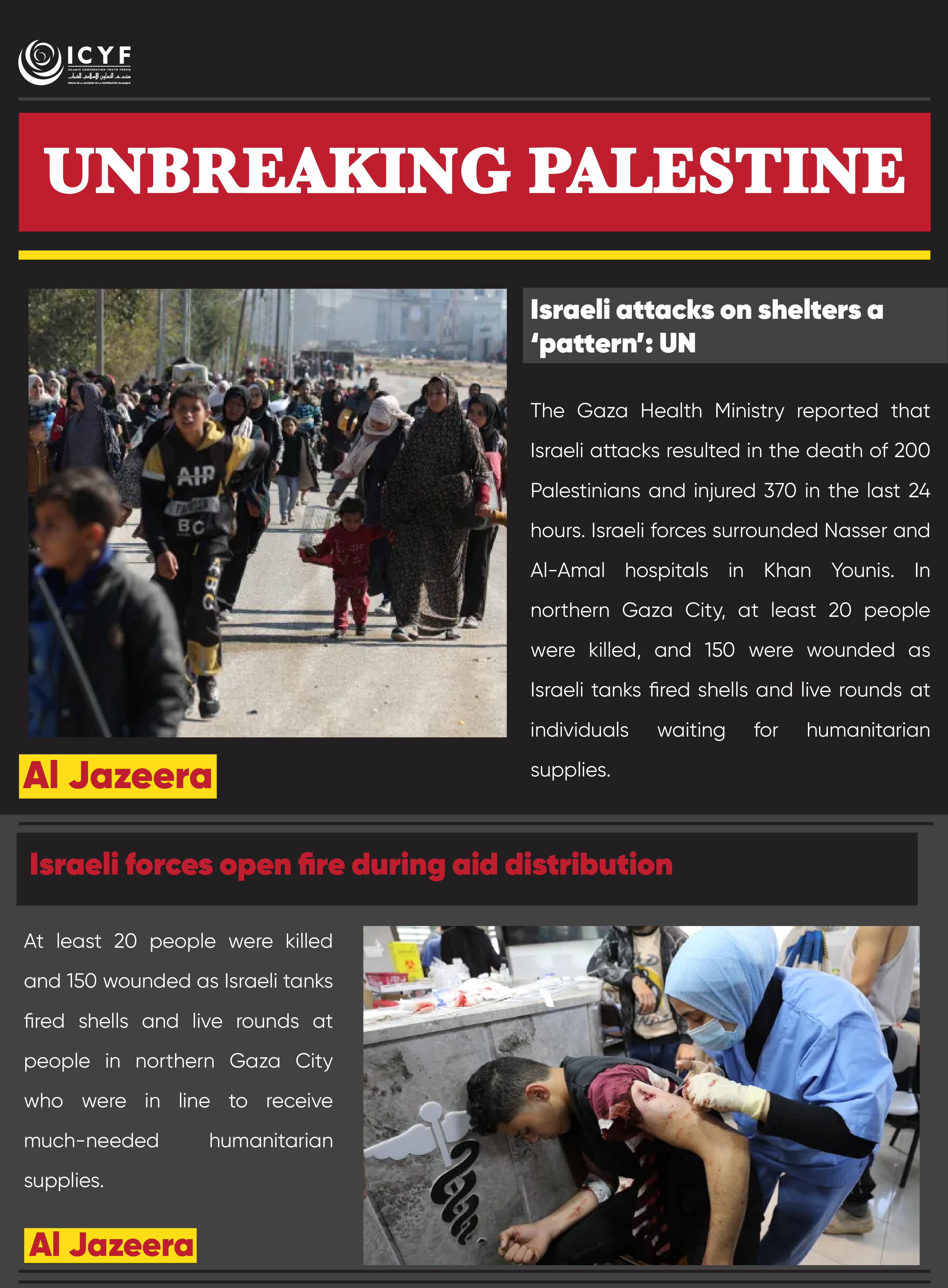 The Gaza Health Ministry reported that Israeli attacks resulted in the death of 200 Palestinians and injured 370 in the last 24 hours. Israeli forces surrounded Nasser and Al-Amal hospitals in Khan Younis. In northern Gaza City, at least 20 people were killed, and 150 were wounded as Israeli tanks fired shells and live rounds at individuals waiting for humanitarian supplies.