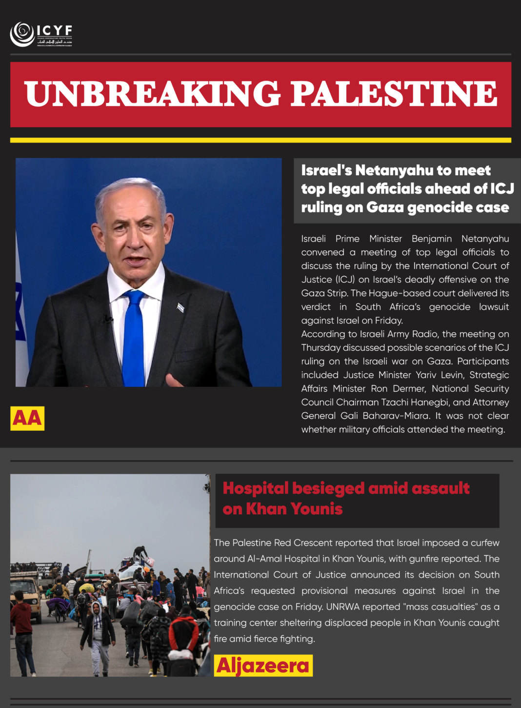 Israeli Prime Minister Benjamin Netanyahu convened a meeting of top legal officials to discuss the ruling by the International Court of Justice (ICJ) on Israel’s deadly offensive on the Gaza Strip. The Hague-based court delivered its verdict in South Africa’s genocide lawsuit against Israel on Friday. According to Israeli Army Radio, the meeting on Thursday discussed possible scenarios of the ICJ ruling on the Israeli war on Gaza. Participants included Justice Minister Yariv Levin, Strategic Affairs Minister Ron Dermer, National Security Council Chairman Tzachi Hanegbi, and Attorney General Gali Baharav-Miara. It was not clear whether military officials