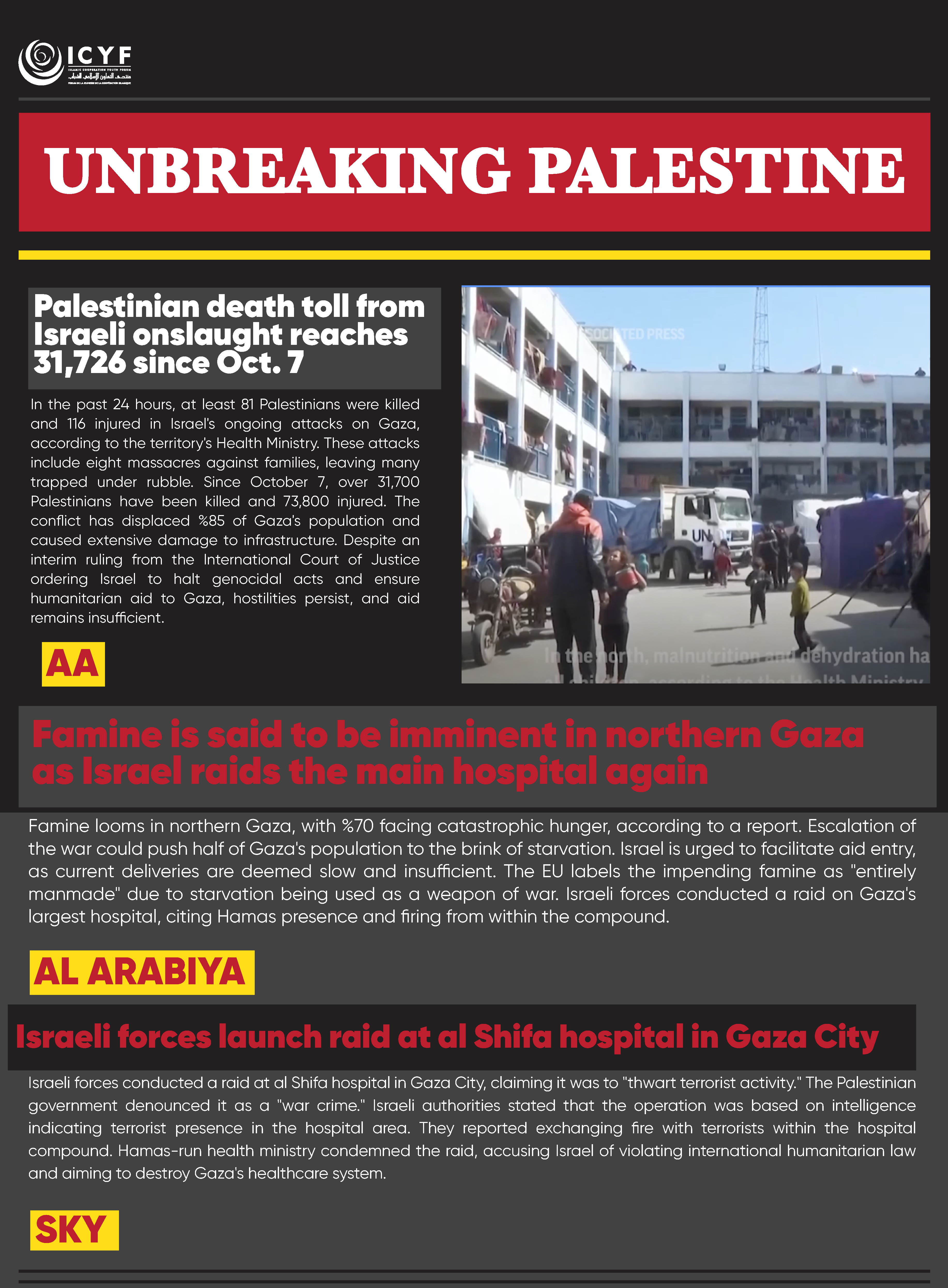 attacks on Gaza, according to the territory’s Health Ministry. These attacks include eight massacres against families, leaving many trapped under rubble. Since October 7, over 31,700 Palestinians have been killed and 73,800 injured. The conflict has displaced 85% of Gaza’s population and caused extensive damage to infrastructure. Despite an interim ruling from the International Court of Justice ordering Israel to halt genocidal acts and ensure humanitarian aid to Gaza, hostilities persist, and aid remains insufficient.