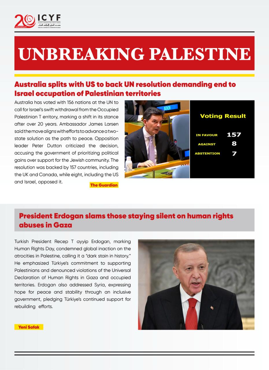 Turkish President Recep T ayyip Erdogan, marking Human Rights Day, condemned global inaction on the atrocities in Palestine, calling it a “dark stain in history.” He emphasized Türkiye’s commitment to supporting Palestinians and denounced violations of the Universal Declaration of Human Rights in Gaza and occupied territories. Erdogan also addressed Syria, expressing hope for peace and stability through an inclusive government, pledging Türkiye’s continued support for rebuilding efforts.