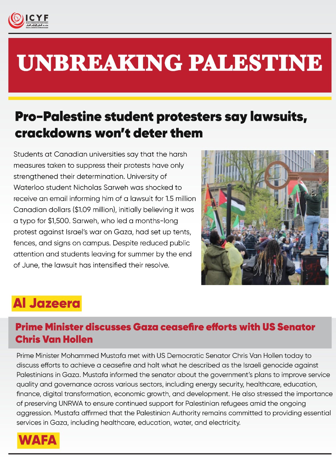 Students at Canadian universities say that the harsh measures taken to suppress their protests have only strengthened their determination. University of Waterloo student Nicholas Sarweh was shocked to receive an email informing him of a lawsuit for 1.5 million Canadian dollars ($1.09 million), initially believing it was a typo for $1,500. Sarweh, who led a months-long protest against Israel’s war on Gaza, had set up tents, fences, and signs on campus. Despite reduced public attention and students leaving for summer by the end of June, the lawsuit has intensified their resolve.