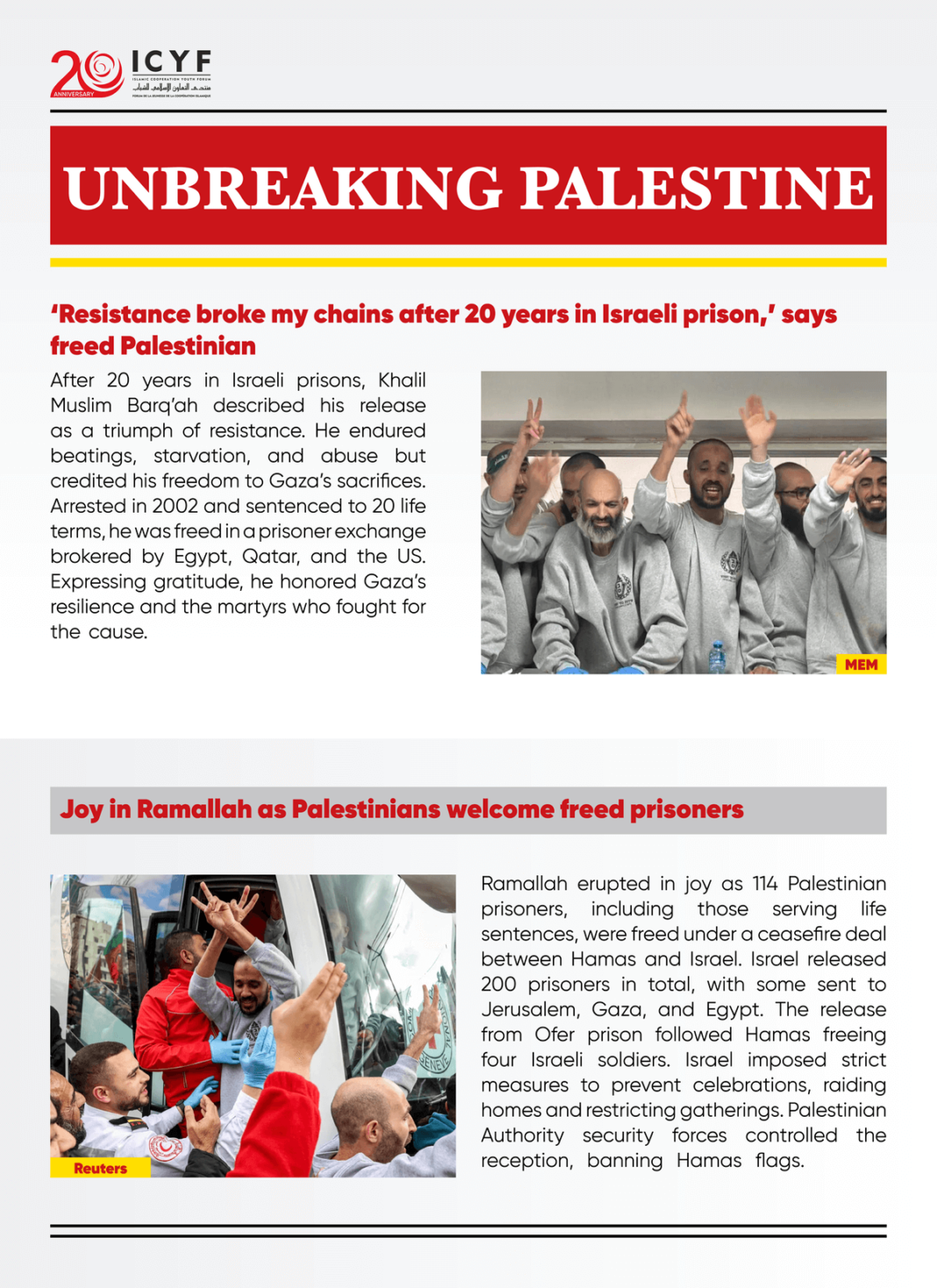After 20 years in Israeli prisons, Khalil Muslim Barq’ah described his release as a triumph of resistance. He endured beatings, starvation, and abuse but credited his freedom to Gaza’s sacrifices. Arrested in 2002 and sentenced to 20 life terms, he was freed in a prisoner exchange brokered by Egypt, Qatar, and the US. Expressing gratitude, he honored Gaza’s resilience and the martyrs who fought for the cause.