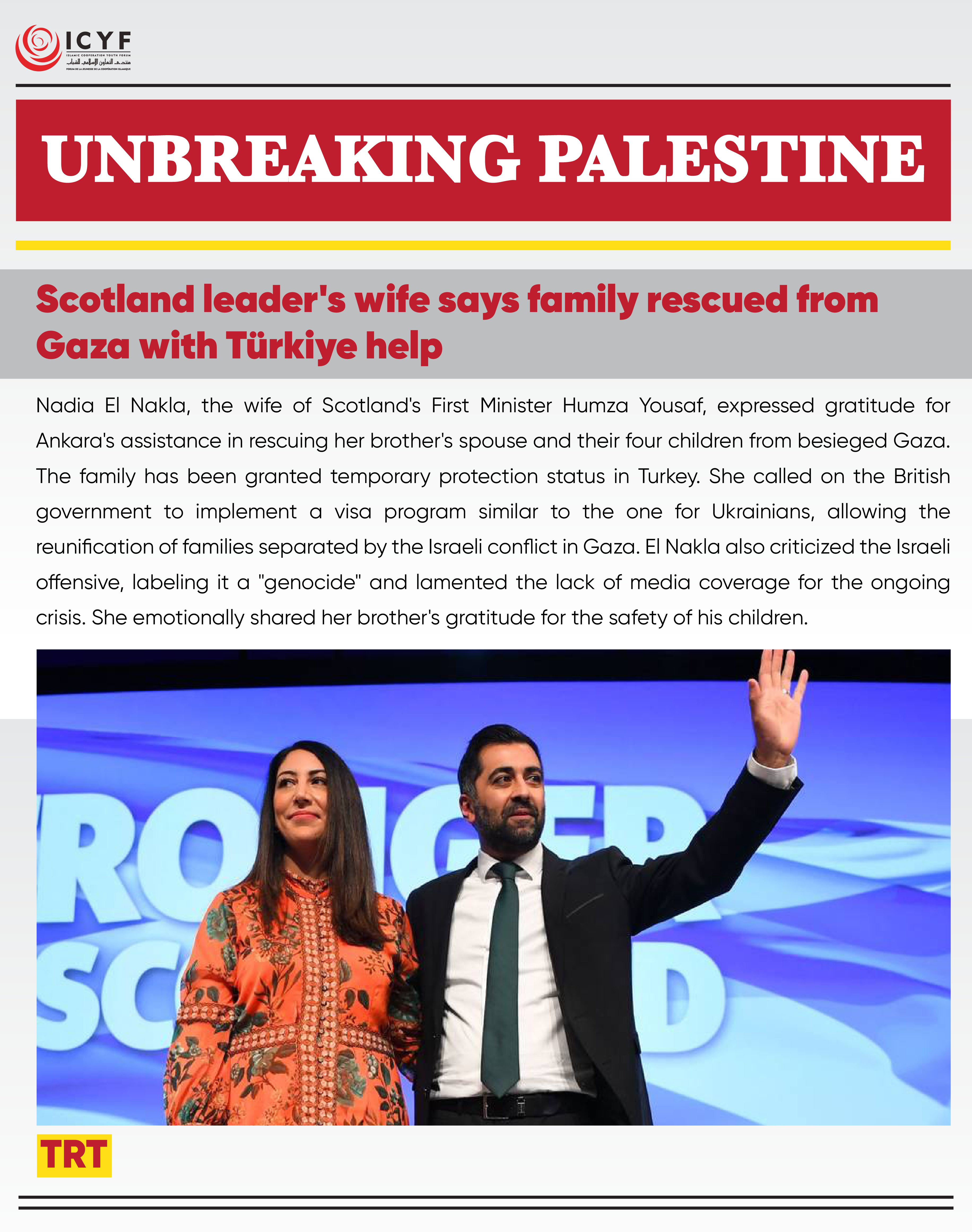 Nadia El Nakla, the wife of Scotland’s First Minister Humza Yousaf, expressed gratitude for Ankara’s assistance in rescuing her brother’s spouse and their four children from besieged Gaza. The family has been granted temporary protection status in Turkey. She called on the British government to implement a visa program similar to the one for Ukrainians, allowing the reunification of families separated by the Israeli conflict in Gaza. El Nakla also criticized the Israeli offensive, labeling it a “genocide” and lamented the lack of media coverage for the ongoing crisis. She emotionally shared her brother’s gratitude for the safety of his children.