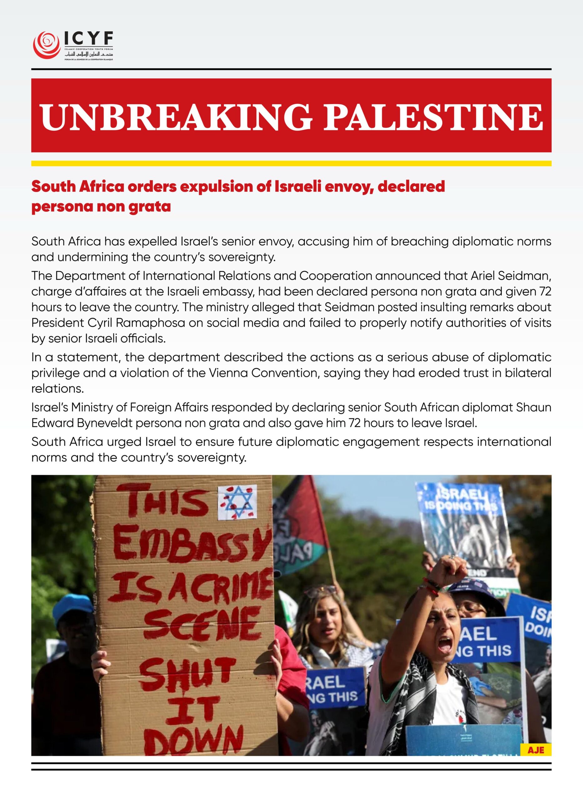 The Department of International Relations and Cooperation announced that Ariel Seidman, charge d’affaires at the Israeli embassy, had been declared persona non grata and given 72 hours to leave the country. The ministry alleged that Seidman posted insulting remarks about President Cyril Ramaphosa on social media and failed to properly notify authorities of visits by senior Israeli officials.
