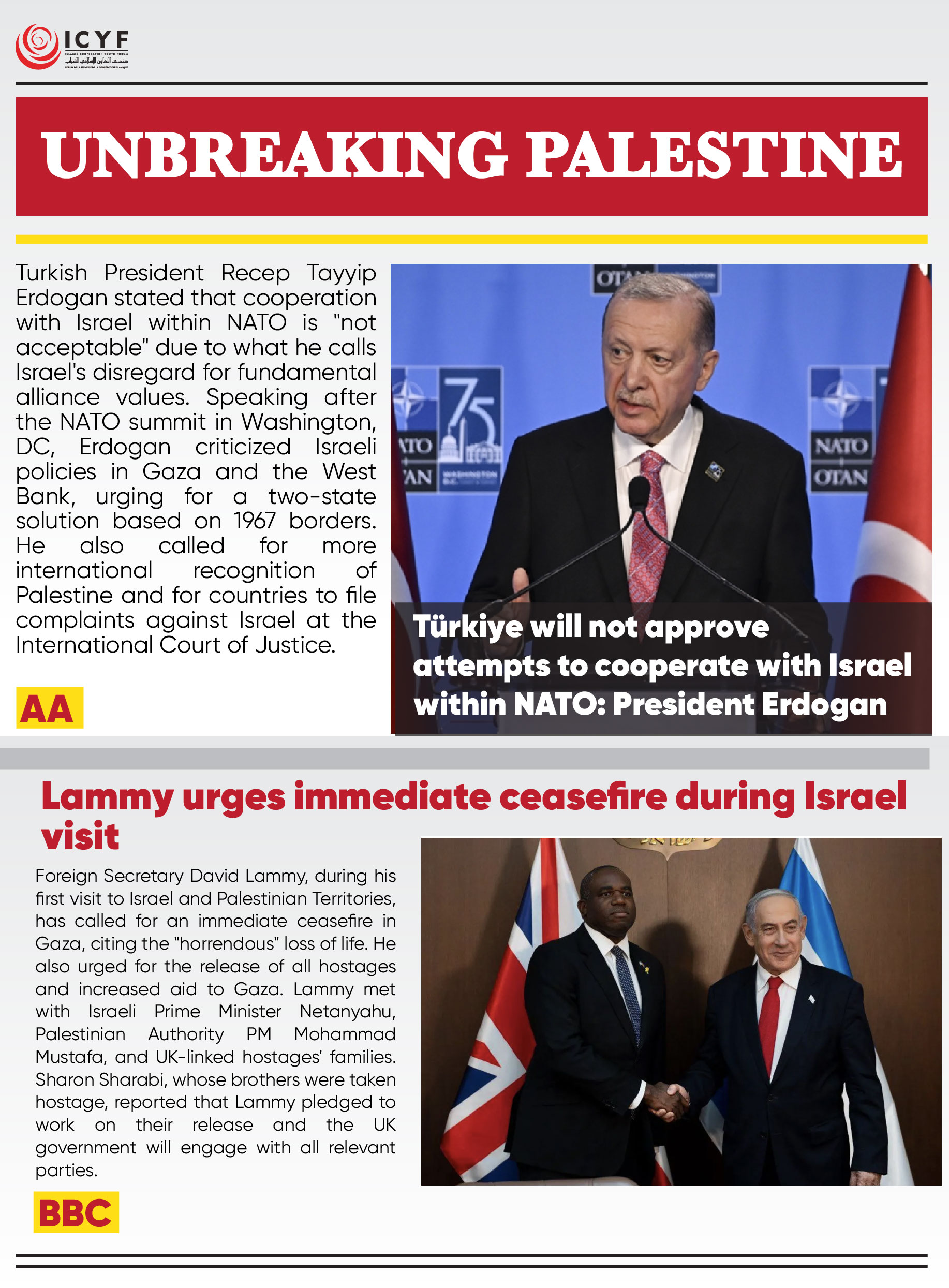 Turkish President Recep Tayyip Erdogan stated that cooperation with Israel within NATO is “not acceptable” due to what he calls Israel’s disregard for fundamental alliance values. Speaking after the NATO summit in Washington, DC, Erdogan criticized Israeli policies in Gaza and the West Bank, urging for a two-state solution based on 1967 borders. He also called for more international recognition of Palestine and for countries to file complaints against Israel at the International Court of Justice.