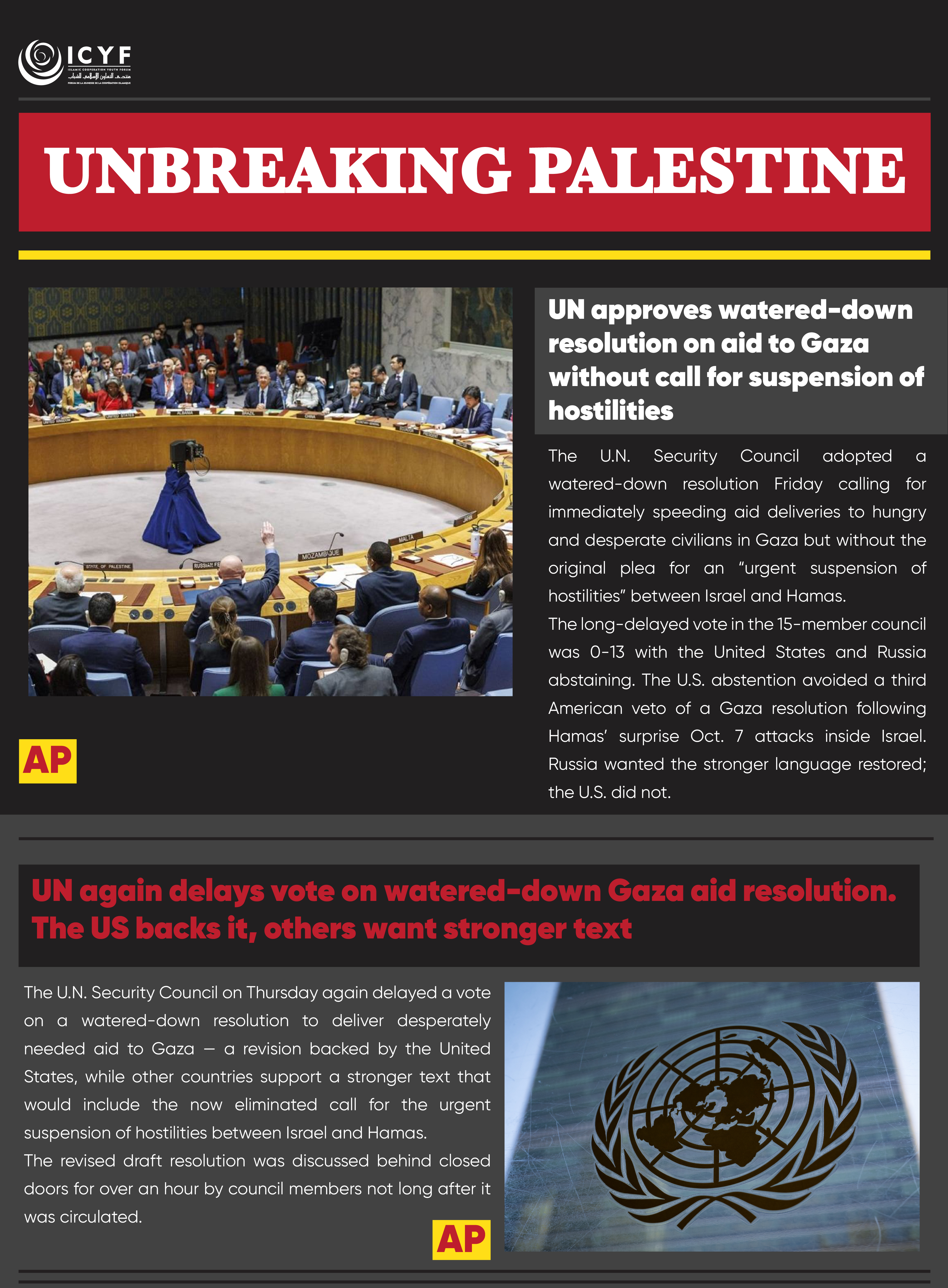 The U.N. Security Council adopted a watered-down resolution Friday calling for immediately speeding aid deliveries to hungry and desperate civilians in Gaza but without the original plea for an “urgent suspension of hostilities” between Israel and Hamas. The long-delayed vote in the 15-member council was 13-0 with the United States and Russia abstaining. The U.S. abstention avoided a third American veto of a Gaza resolution following Hamas’ surprise Oct. 7 attacks inside Israel. Russia wanted the stronger language restored; the U.S. did not.