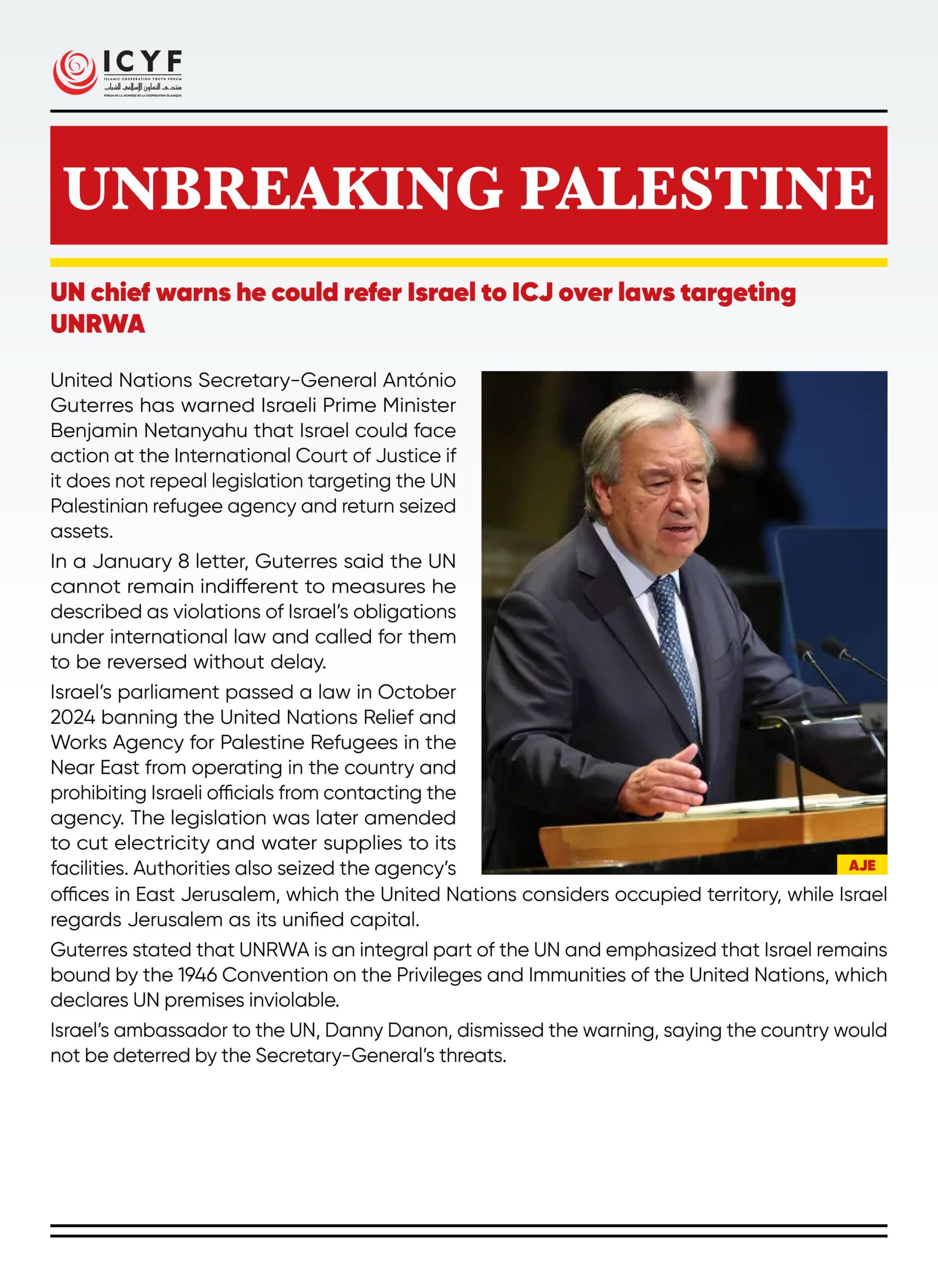 United Nations Secretary-General António Guterres has warned Israeli Prime Minister Benjamin Netanyahu that Israel could face action at the International Court of Justice if it does not repeal legislation targeting the UN Palestinian refugee agency and return seized assets.