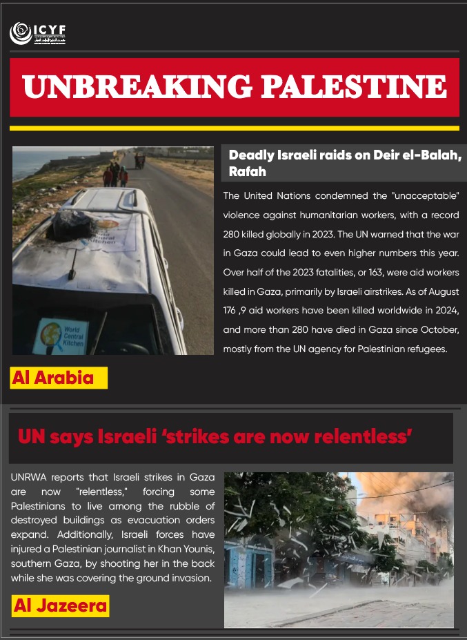UNRWA reports that Israeli strikes in Gaza are now “relentless,” forcing some Palestinians to live among the rubble of destroyed buildings as evacuation orders expand. Additionally, Israeli forces have injured a Palestinian journalist in Khan Younis, southern Gaza, by shooting her in the back while she was covering the ground invasion.