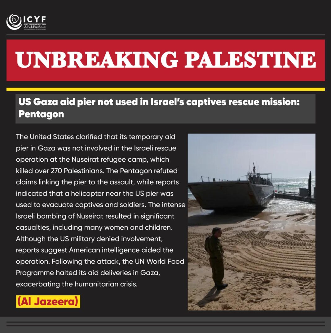The United States clarified that its temporary aid pier in Gaza was not involved in the Israeli rescue operation at the Nuseirat refugee camp, which killed over 270 Palestinians. The Pentagon refuted claims linking the pier to the assault, while reports indicated that a helicopter near the US pier was used to evacuate captives and soldiers. The intense Israeli bombing of Nuseirat resulted in significant casualties, including many women and children. Although the US military denied involvement, reports suggest American intelligence aided the operation. Following the attack, the UN World Food Programme halted its aid deliveries in Gaza, exacerbating the humanitarian crisis.