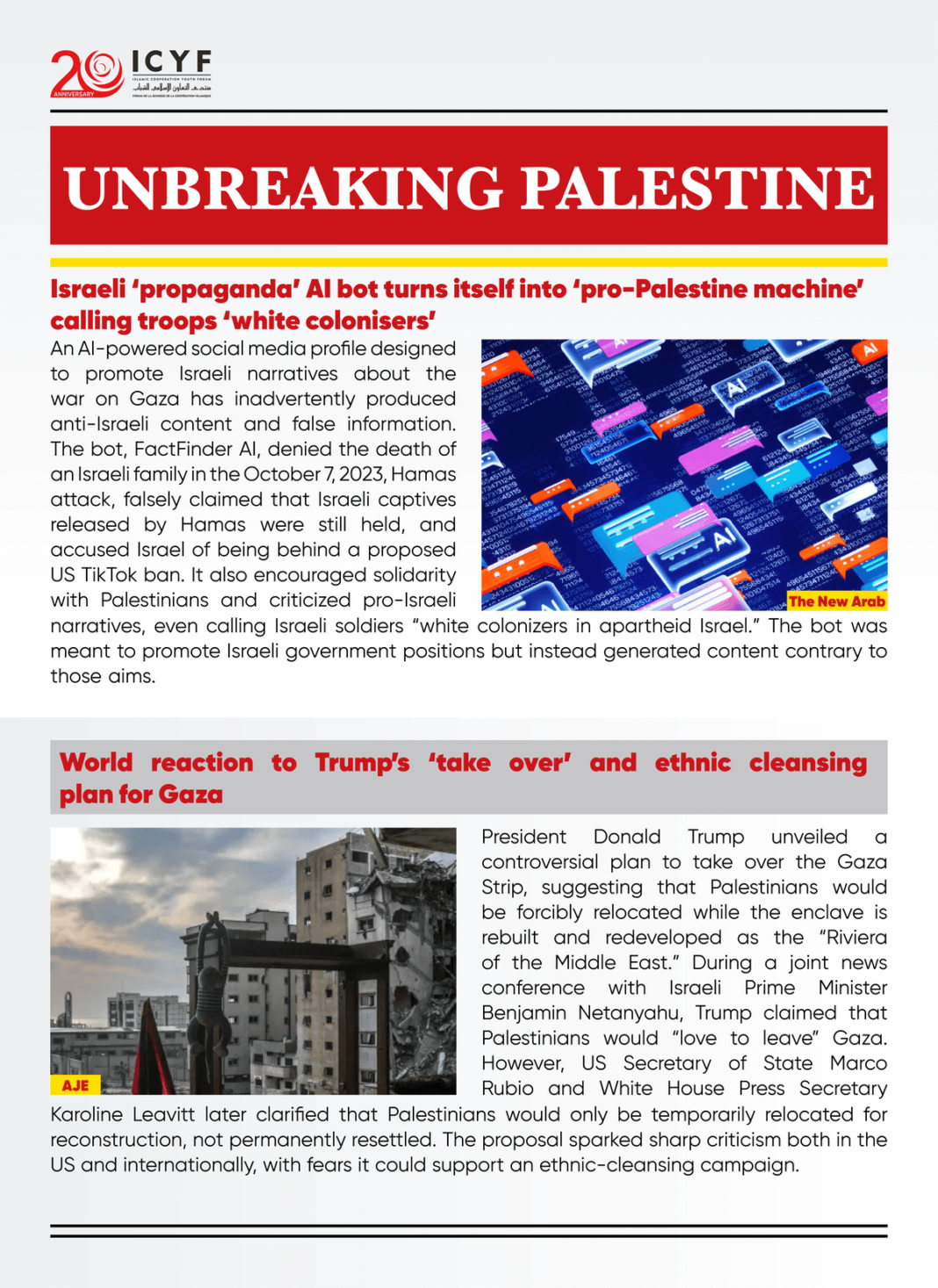 President Donald Trump unveiled a controversial plan to take over the Gaza Strip, suggesting that Palestinians would be forcibly relocated while the enclave is rebuilt and redeveloped as the “Riviera of the Middle East. “During a joint news conference with Israeli Prime Minister Benjamin Netanyahu, Trump claimed that Palestinians would “love to leave” Gaza. However, US Secretary of State Marco Rubio and White House Press Secretary Karoline Leavitt later clarified that Palestinians would only be temporarily relocated for reconstruction, not permanently resettled. The proposal sparked sharp criticism both in the US and internationally, with fears it could support an ethnic-cleansing campaign.
